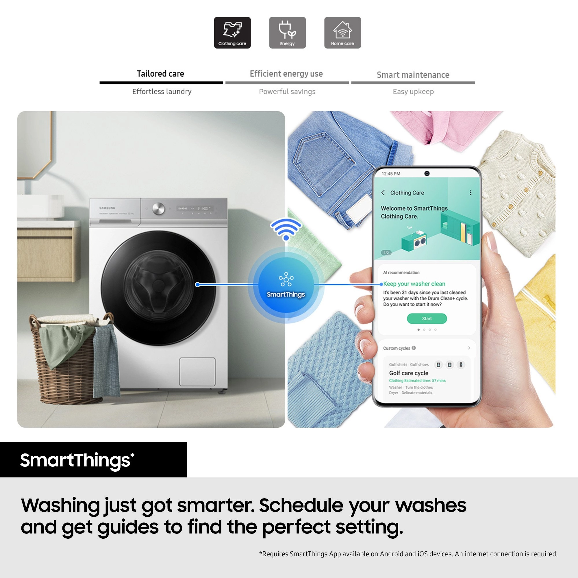 SmartThings Connectivity – Control and monitor your washing machine remotely via the SmartThings app.